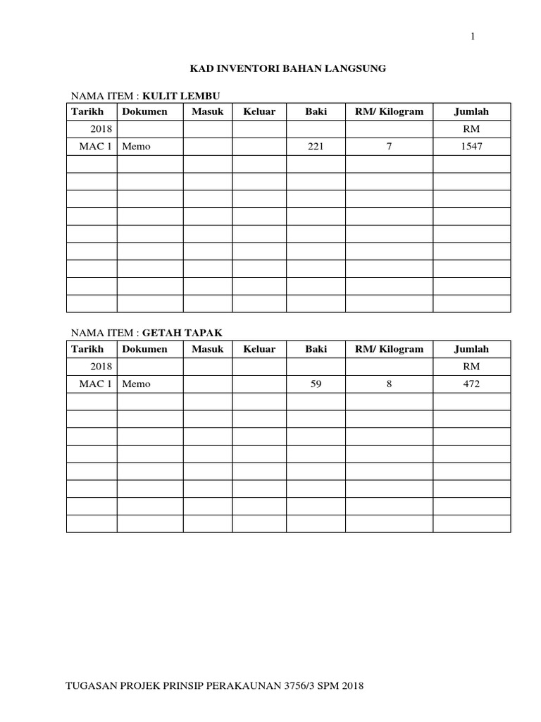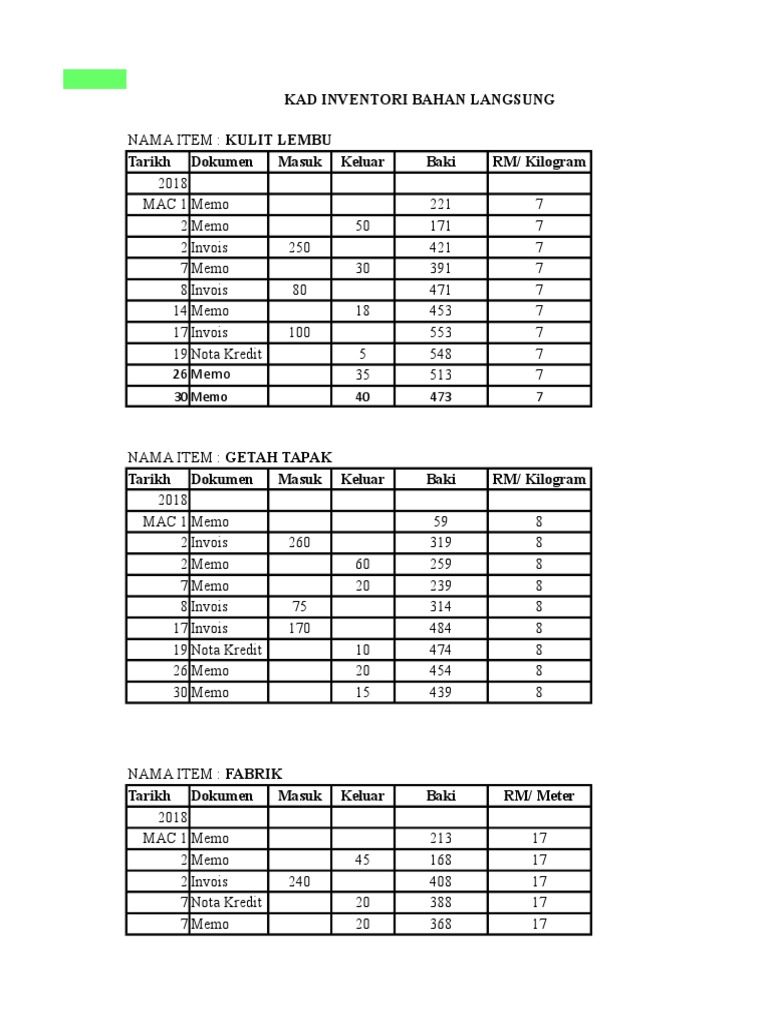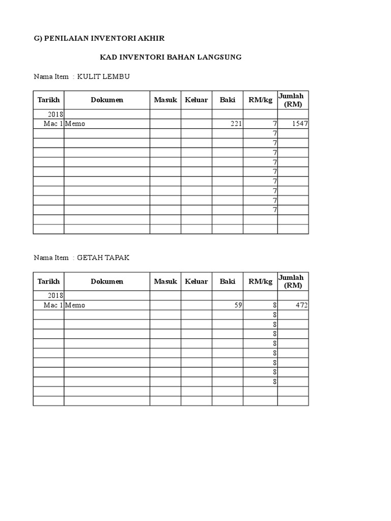 Nama Item Kulit Lembu G Penilaian Inventori Akhir Kad Inventori Bahan Langsung