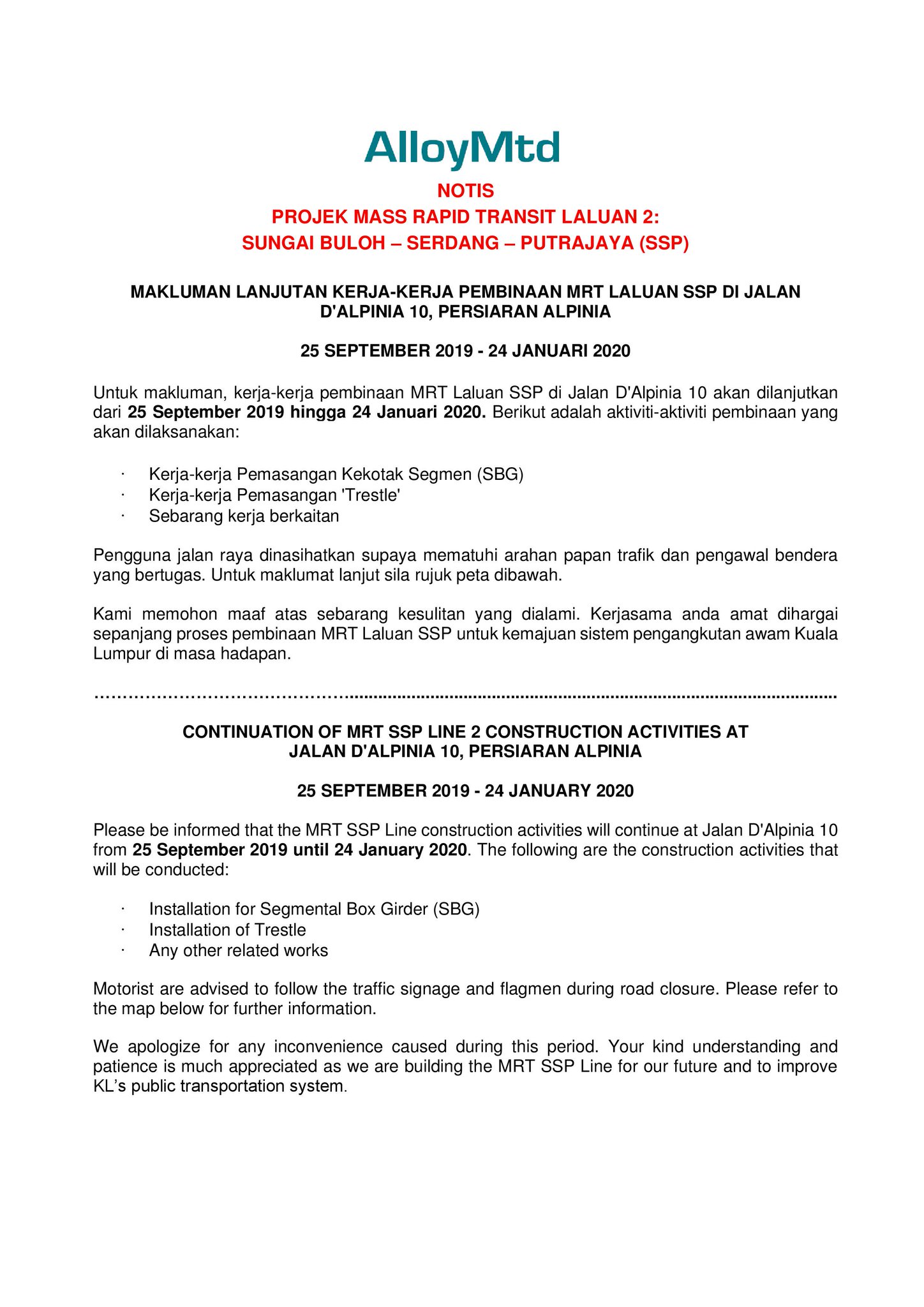 Mrt Corp On Twitter Continuation Of Mrt Ssp Line 2 Construction Activities At Jalan D Alpinia 10 Persiaran Alpinia 25 September 2019 24 January 2020 Kltu Https T Co Plbuldpjya