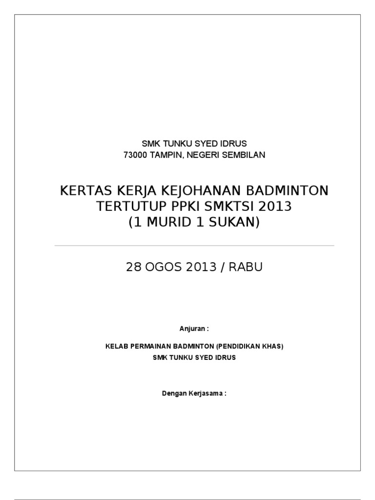 Kertas kerja kejohanan badminton tertutup piala de. Dewan serbaguna pekan air panas. Kertas kerja pertandingan badminton beregu tertutup peringkat ipg kampus keningau anjuran pismp sejarah ambilan jun 2016 semester dua tarikh.