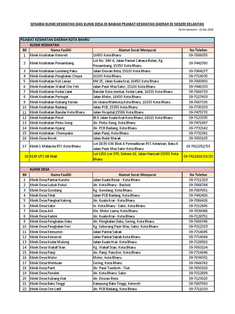 Senarai 12 Klinik Kesihatan Daerah Kota Bharu