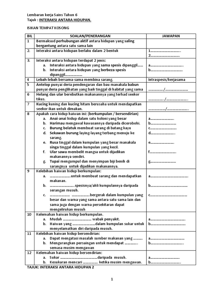 Lembaran Kerja Sains Tahun 6 Interaksi Antara Hidupan