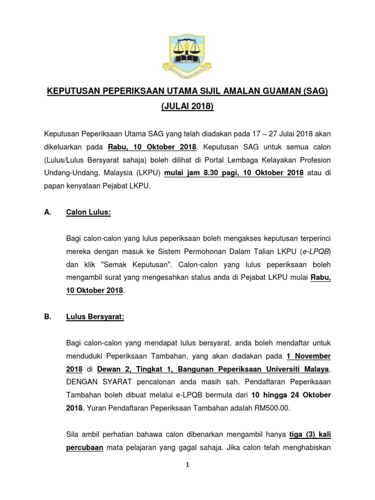 Keputusan Peperiksaan Utama Sijil Amalan Guaman Sag Julai 2018