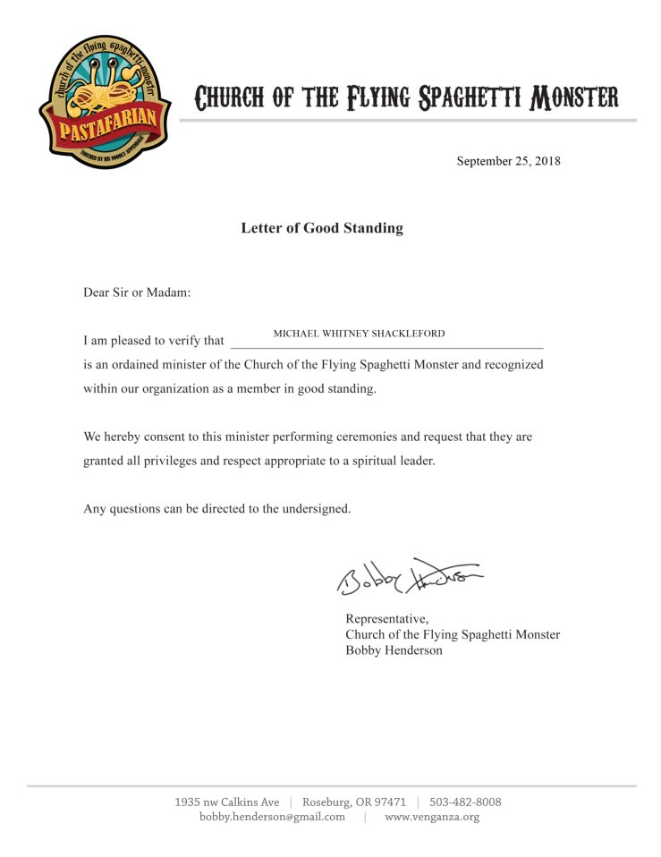 Letter Of Good Standing Church Of The Open Road Marry Your Friends